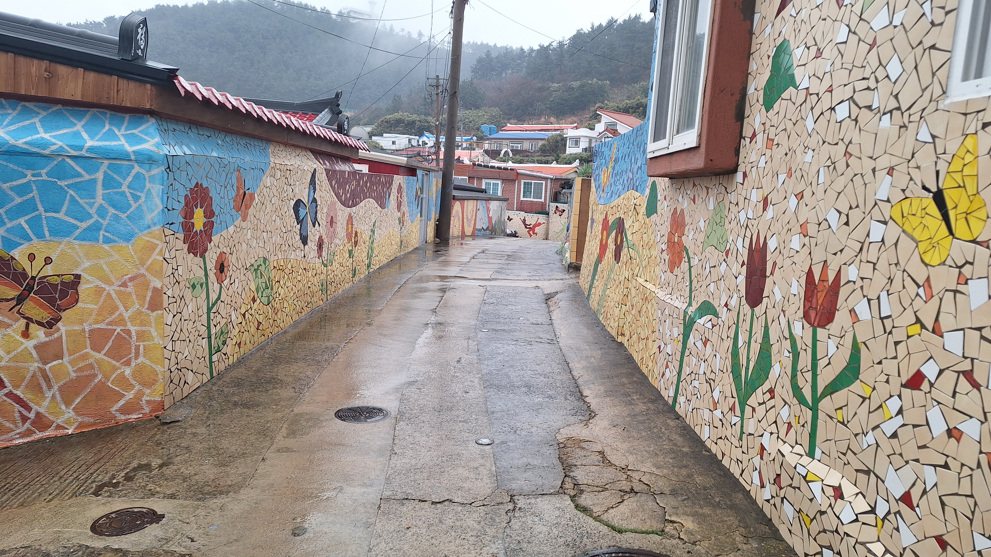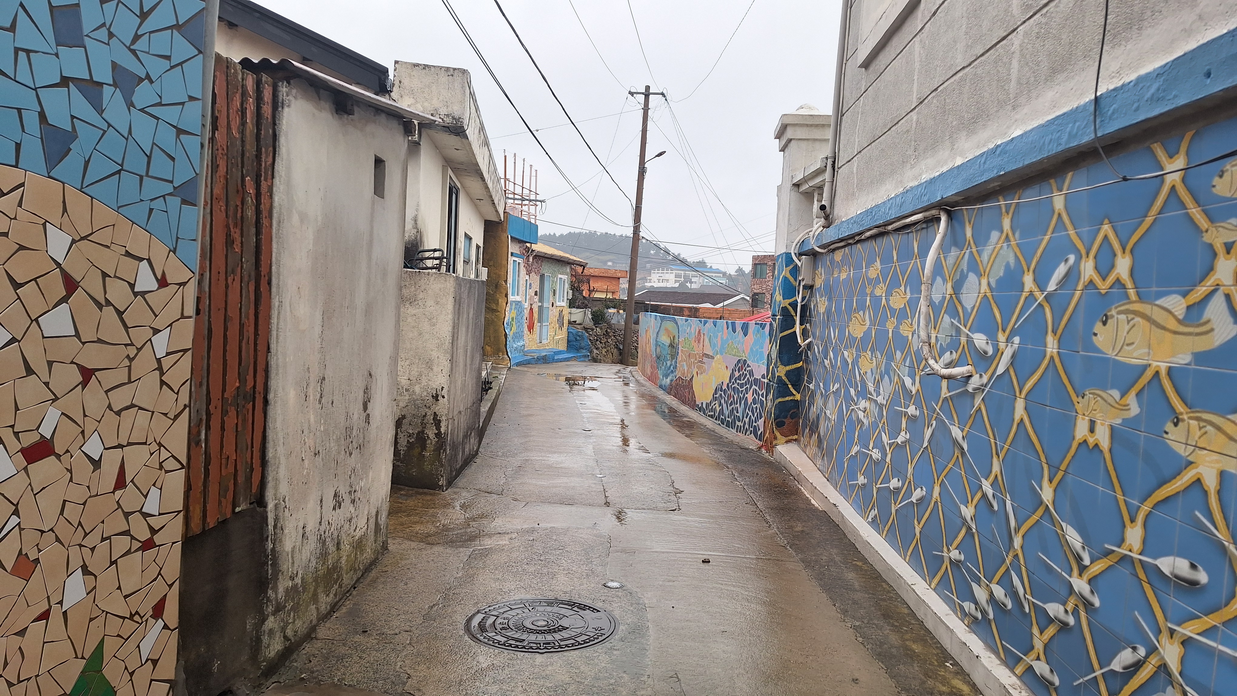 봉골레산에서 내려서 다시 시내를 거쳐 나바론 절벽으로 가는데 골목길이 참 예쁘다. 다른 곳 처럼 그림이 아니고 저렇게 자기를 붙여 놓았다.