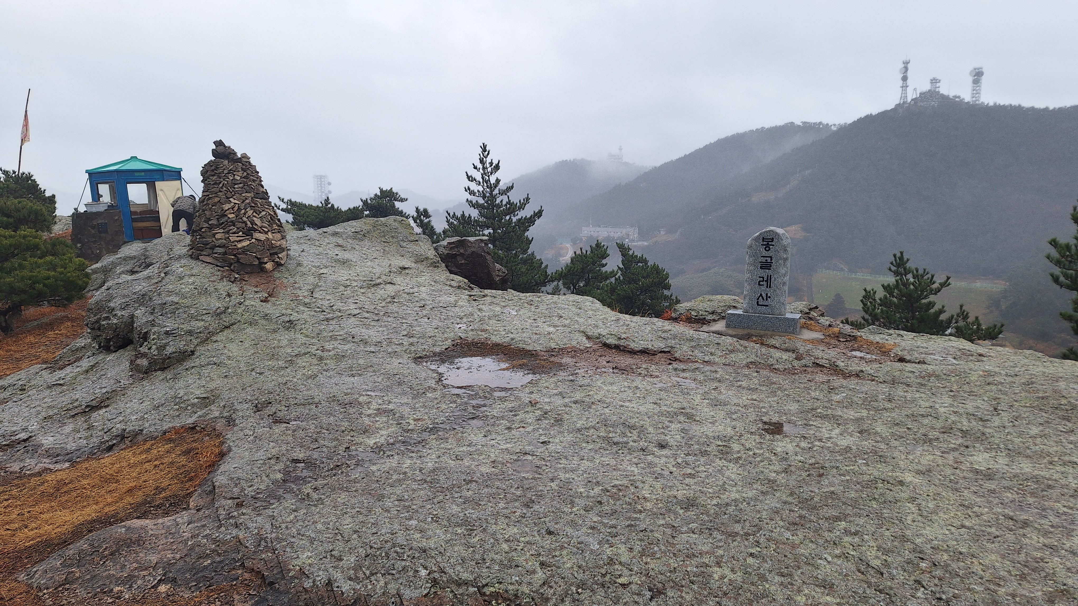 비가 오는데도 산불 감시초소에 두 분이 근무하신다. 가볍게 인사하고 돌아서 내려간다. 날씨가 흐려서 조망은 뭐 별로다.